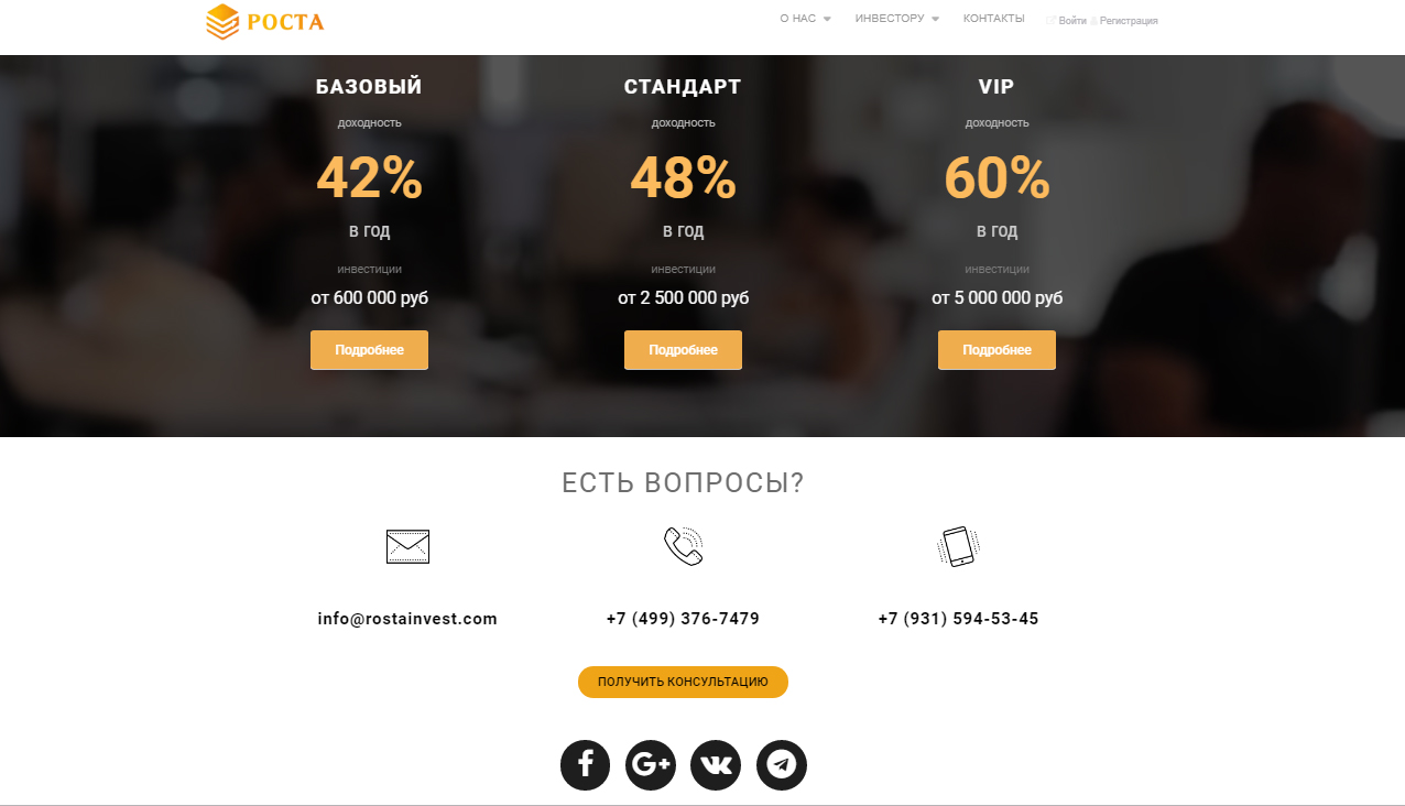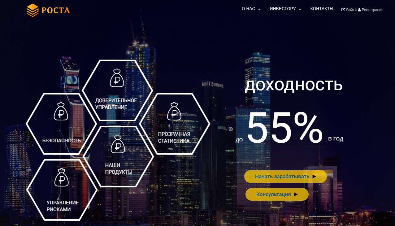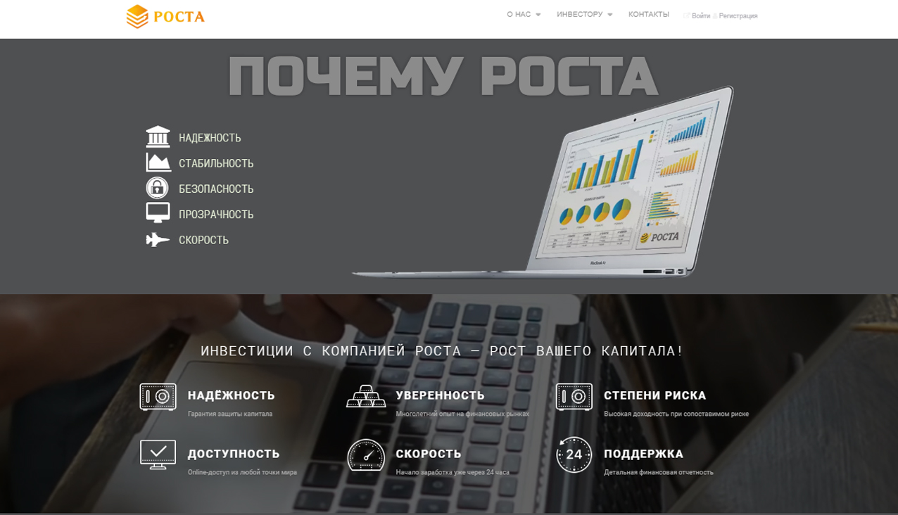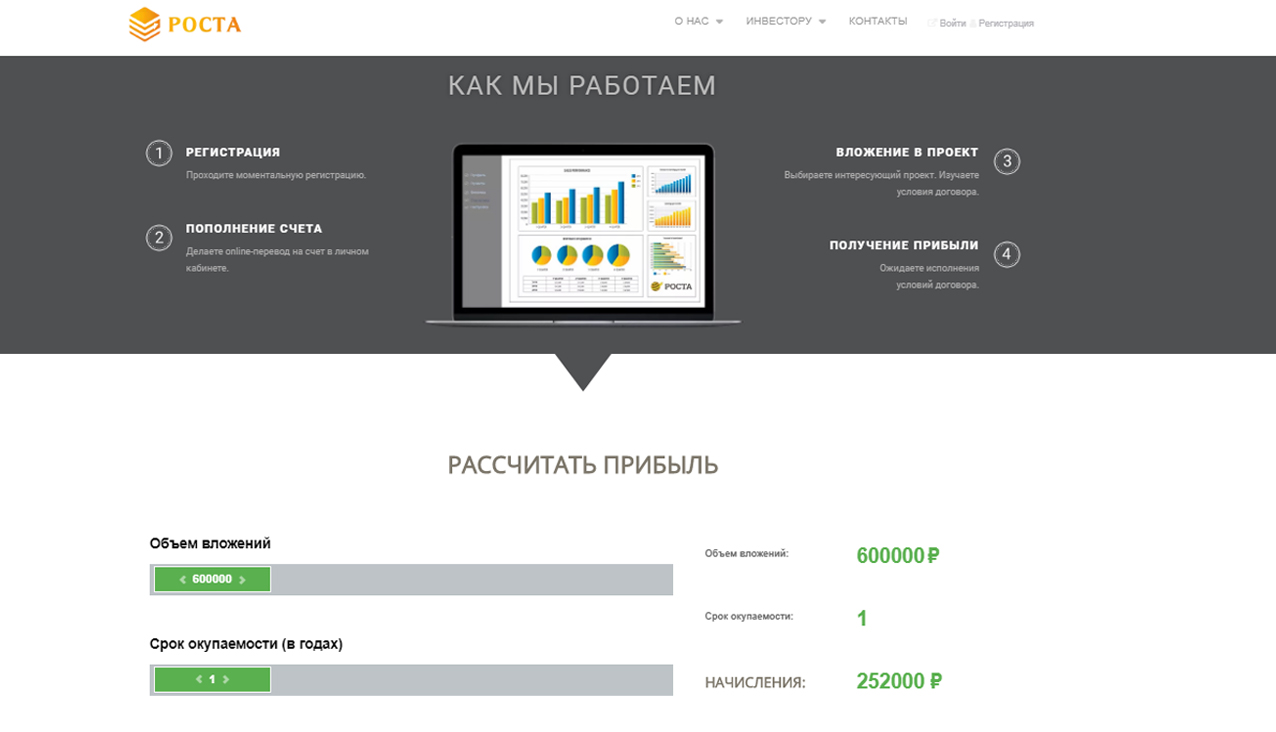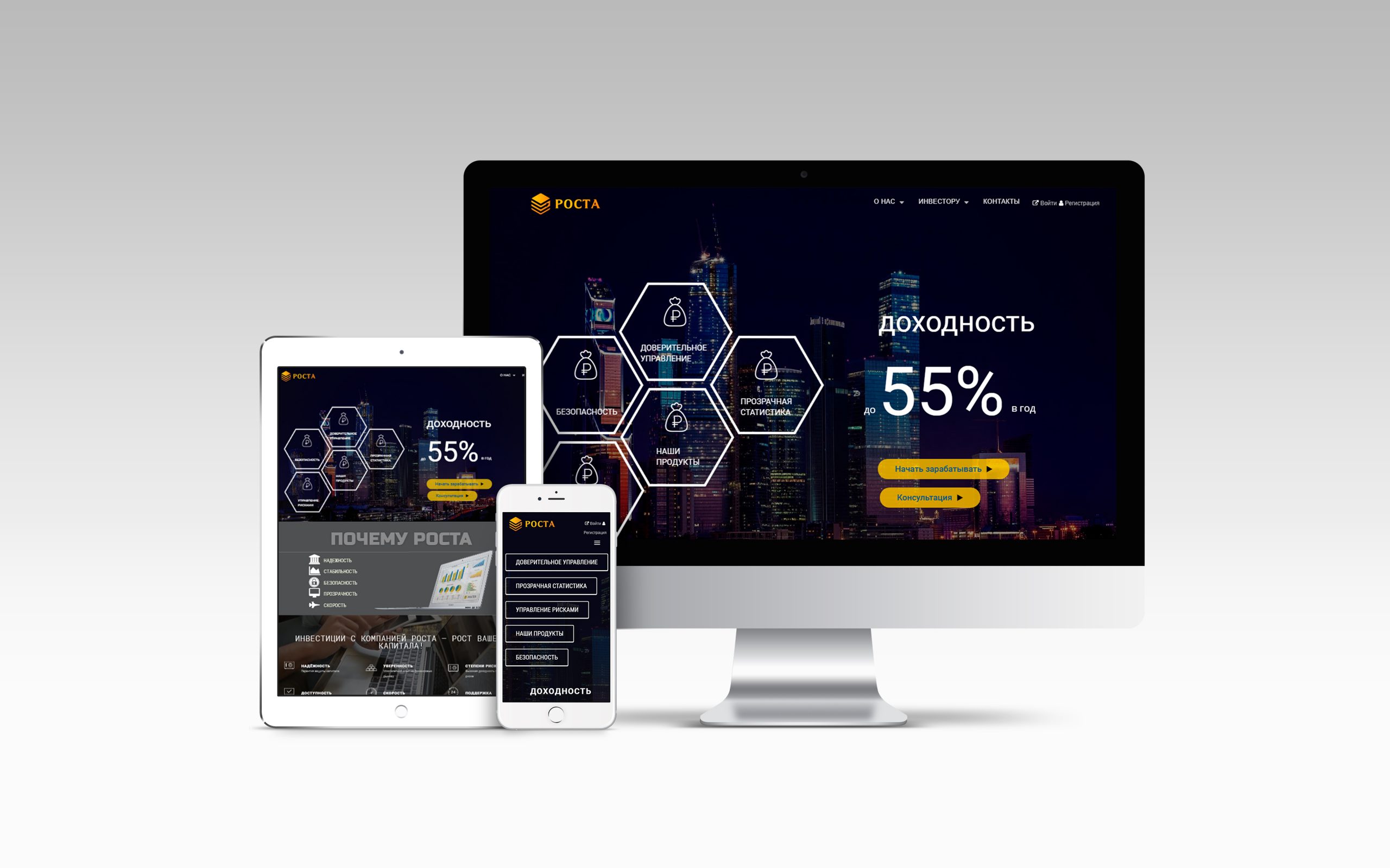 Разработка сайта инвестиционной компании «РОСТА». Личный кабинет пользователя, биллинг-система, калькуляторы, система инвестирования со статистикой, адаптивная верстка и современный интерфейс.